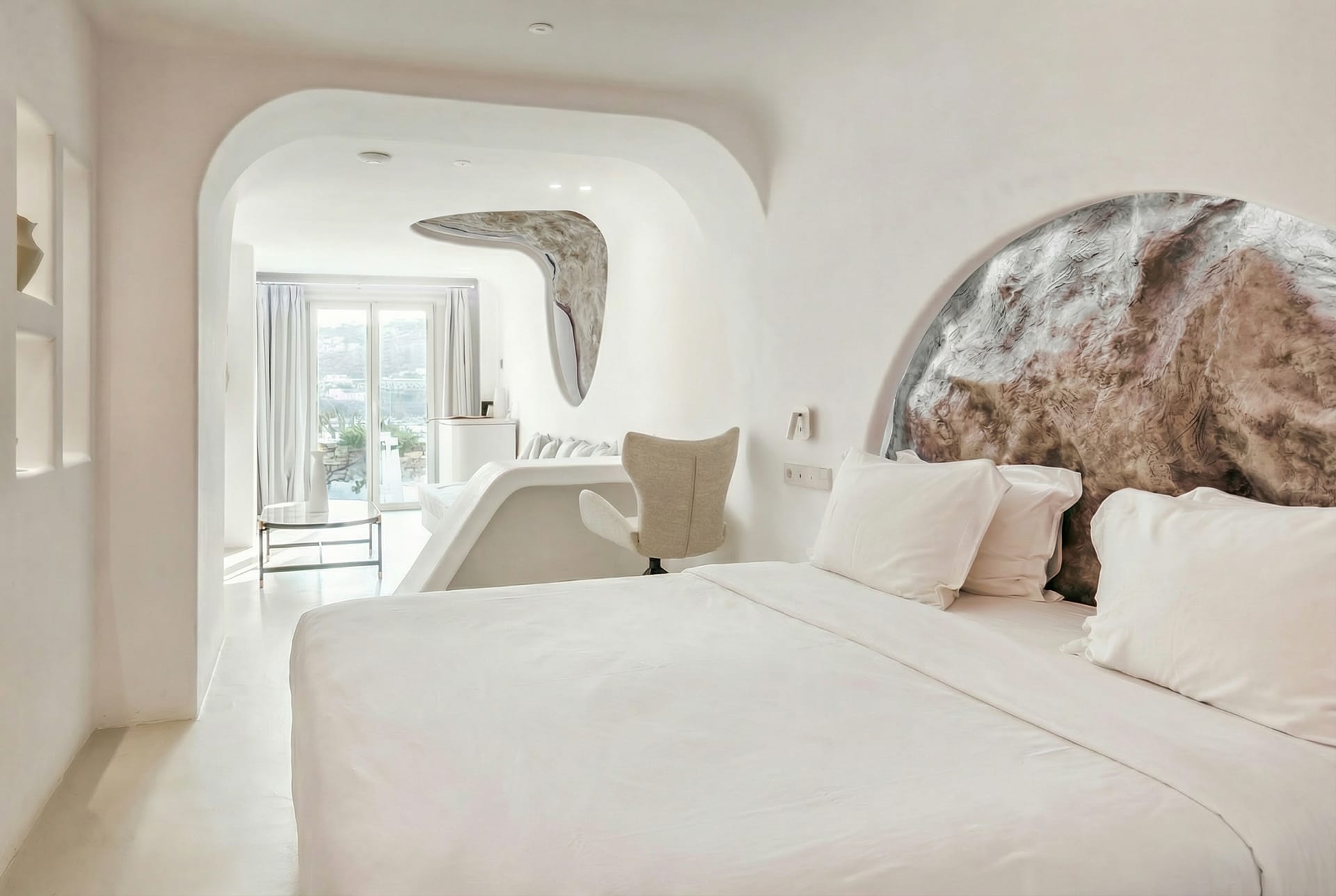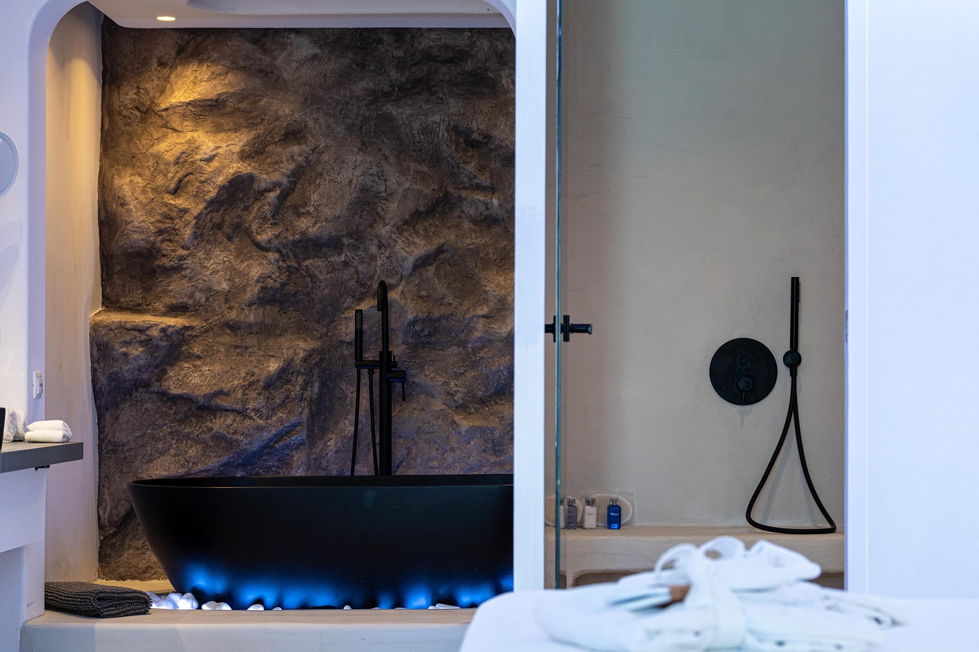 A crystal clear pool awaits you right outside this Suite to offer you unique moments of relaxation under the Mediterranean sun. The furnished terrace offers sunloungers and chairs to relish your day under the sun, gazing the sea.