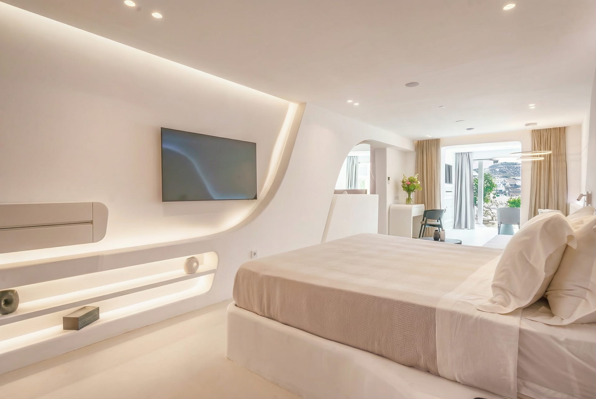 Enjoy the crystal clear Pool of your Suite for unique moments of relaxation under the Mediterranean sun. Luxuriously appointed, with ingenious structural and architectural elements, soothing lighting and sensual ambiance. These Suites feature a spacious bedroom area with a Queen size bed, a living room with a couch, one or two bathrooms featuring a bathtub and shower or just a large shower and furnished verandas.