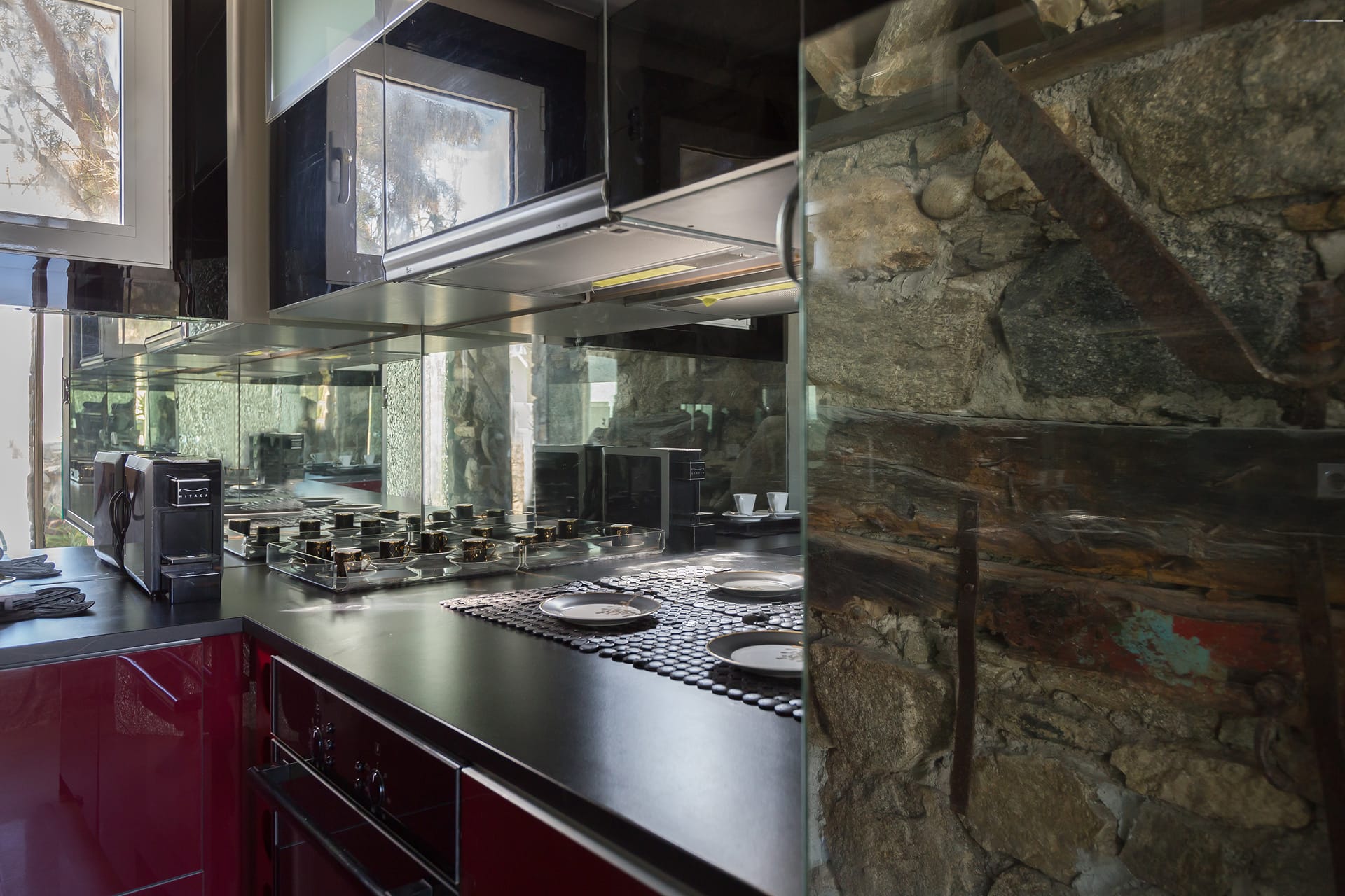 The building is split in three levels. The ground floor has a lounge and a bathroom with shower. The private pool starts from the outside and ends up inside the villa. The first floor features the master bedroom, a balcony, and a bathroom with a bathtub and a window that overlooks the bay of Ornos. The second floor is ideal for romantic candlelit dinners and small intimate gatherings, since it comes with a bar and a long antique table. This floor also has a fully equipped kitchen –used by the villa’s staff- and a bathroom with shower.